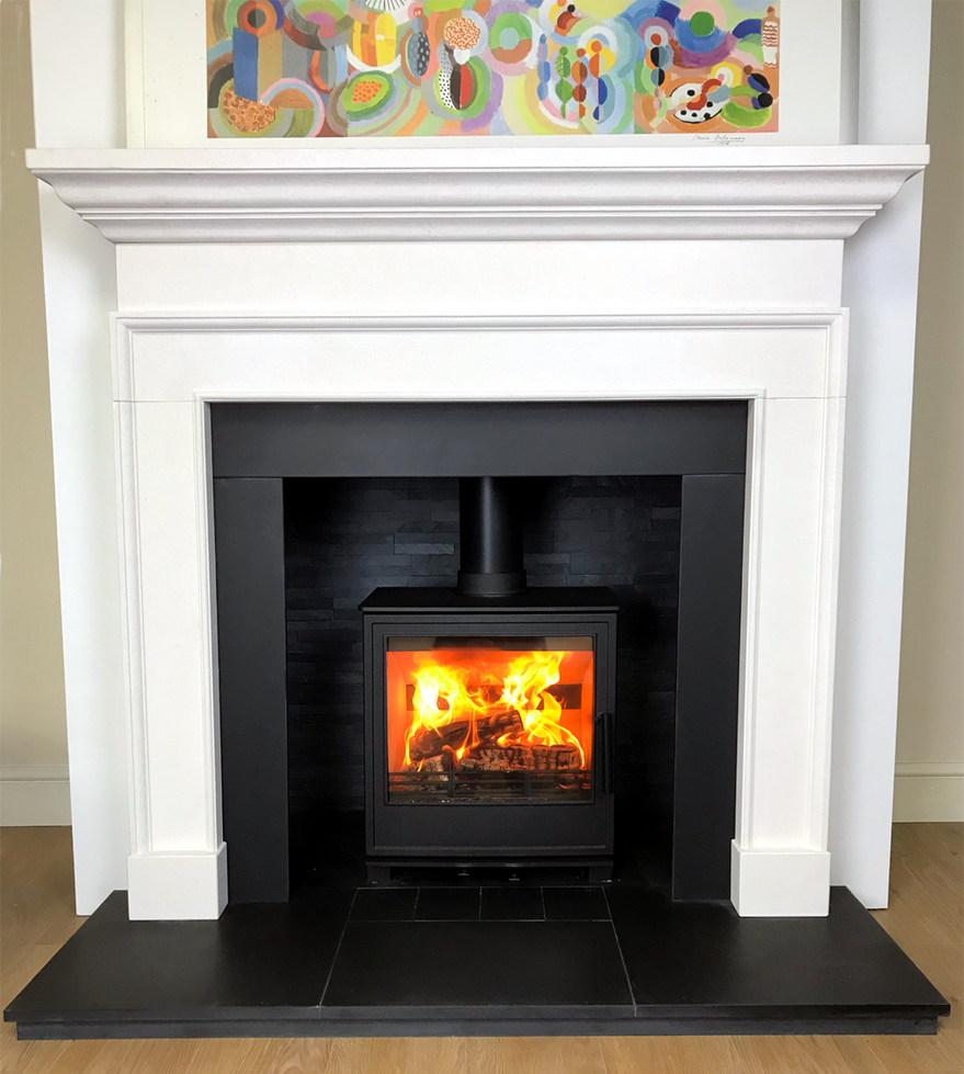 The classically styled Deben 5kW cast iron stove is designed to fit seamlessly into a standard builder's opening, bringing both a traditional and modern aesthetic to any room.